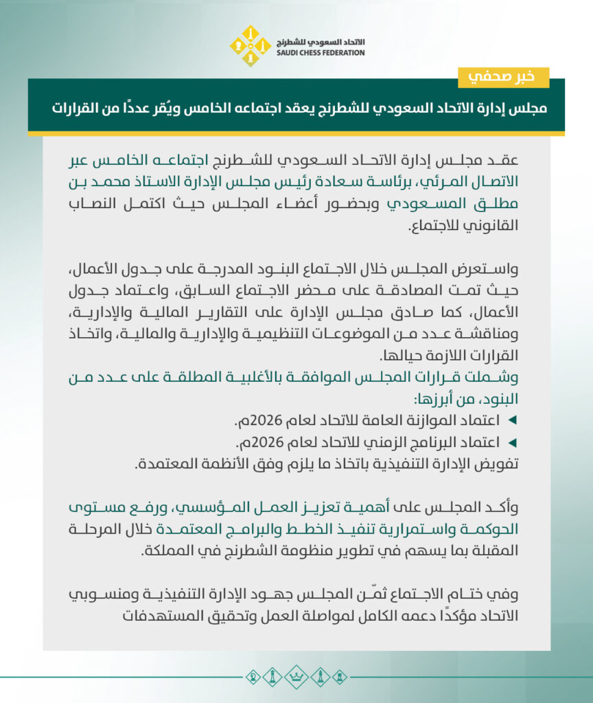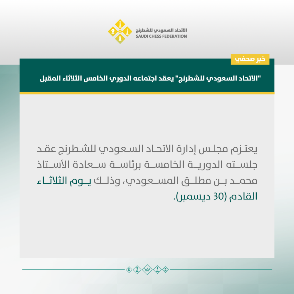 📌مجلس إدارة الاتحاد السعودي للشطرنج يعقد اجتماع مجلس الإدارة الاثنين القادم برئاسة الأستاذ محمد بن مطلق المسعودي
