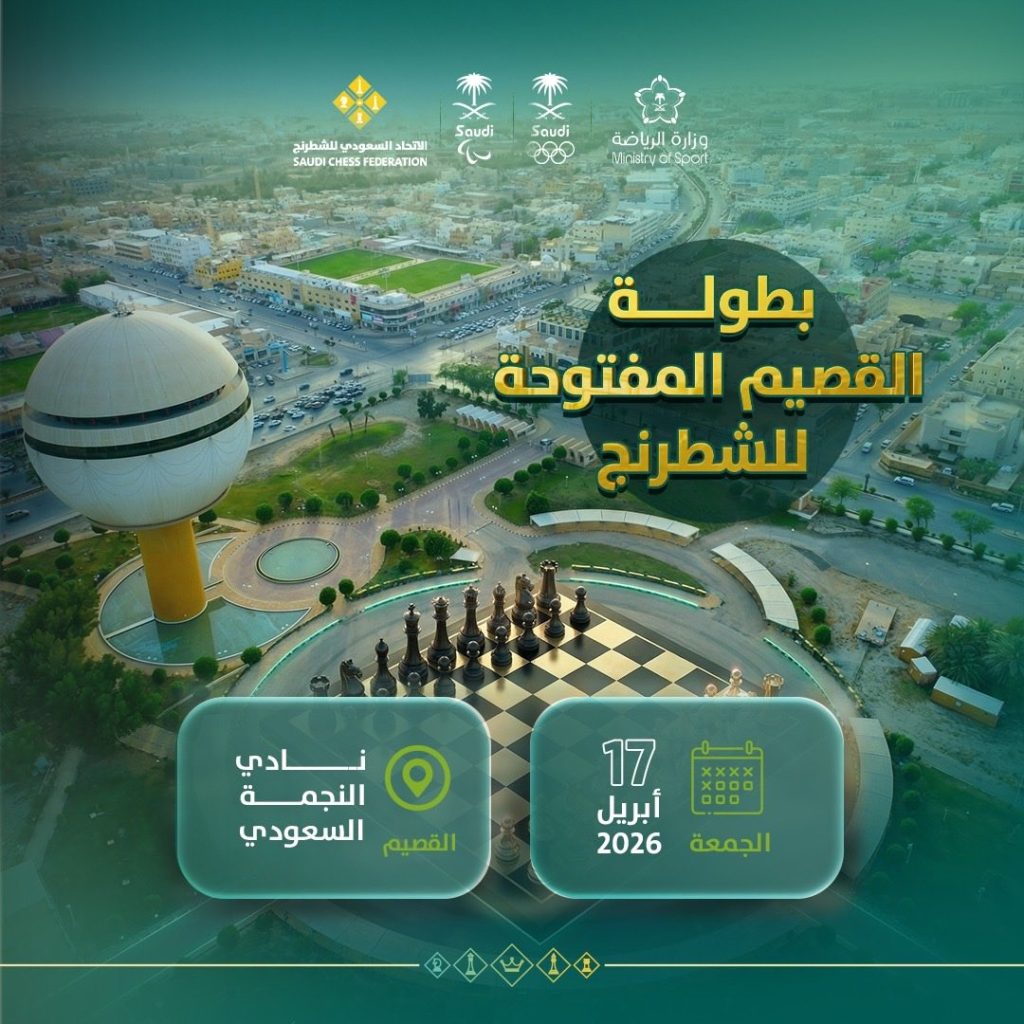 بطولة القصيم المفتوحة للشطرنج♟️ 🗓️ 17 ابريل 2026 📌للتسجيل 👇 https://docs.google.com/forms/d/e/1FAIpQLSdKjWZL9cKzsXuRqUFYbMci6Z4QKhPgYiGQxEEgEa7M1UmQtQ/viewform 📌لائحة البطولة 👇 https://drive.google.com/file/d/1sJyQYTC-EmHoRRuC7v1jCuv9OU9pqzAv/view 📍القصيم – نادي النجمة @alnajmahfc https://share.google/SBbhWfa19ATNecxUQ
