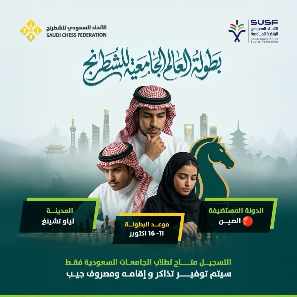 بطولة العالم الجامعية للشطرنج في الصين 🇨🇳♟️ 🗓️ 11- 16 أكتوبر 2026 @Susfchannel 📌التسجيل لطلاب الجامعات السعودية 🇸🇦 👇 https://docs.google.com/forms/d/e/1FAIpQLSeuzMKnfy7IX9KYv62-evqG3bwblDnYjUI7E2j09IYXD081XA/viewform 📌لائحة البطولة 👇 https://drive.google.com/file/d/1UuACtPH8Fg2UFJwC9e4sbZFJdX6-ynoD/view